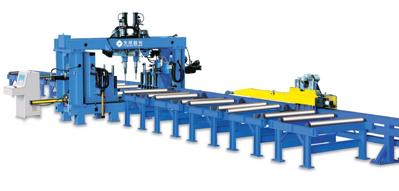 本機(jī)床主要用于對(duì)H型鋼、槽鋼、方管和矩形管等型鋼進(jìn)行鉆孔加工,它主要應(yīng)用于鋼結(jié)構(gòu)建筑、橋梁、電站、海洋石油井平臺(tái)、塔桅等鋼結(jié)構(gòu)行業(yè)。機(jī)床一共采用4個(gè)主軸: 左單元和右單元各有1個(gè)主軸分別對(duì)型鋼的兩個(gè)翼板進(jìn)行鉆孔加工;上單元有2個(gè)主軸,對(duì)型鋼的腹板進(jìn)行鉆孔加工。上單元能裝夾2種不同直徑的鉆頭,可以同時(shí)加工腹板上兩種不同直徑的孔。和腹面上只有單個(gè)主軸的機(jī)床相比,當(dāng)腹板孔徑變化時(shí)不需要手工更換鉆頭,因此該機(jī)床大大節(jié)省了換刀時(shí)間,顯著提高了加工效率和加工精度。該機(jī)床是我公司專利產(chǎn)品